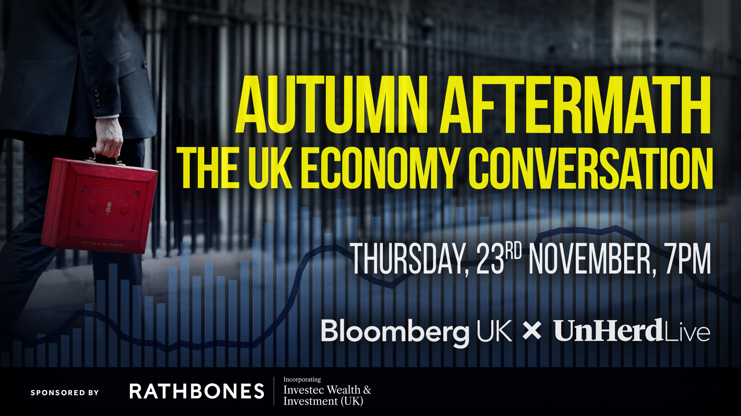 Join Francine Lacqua, Anchor & Editor-at-large for Bloomberg TV and Freddie Sayers, UnHerd Editor-in-Chief, the day after the 2023 Autumn Statement for a panel with: John Micklethwait, Editor-in-Chief of Bloomberg, Allegra Stratton, Bloomberg News contributing editor, Adrian Wooldridge, Global Business Columnist at Bloomberg Opinion and Stephanie Flanders, Head of Bloomberg Economics.