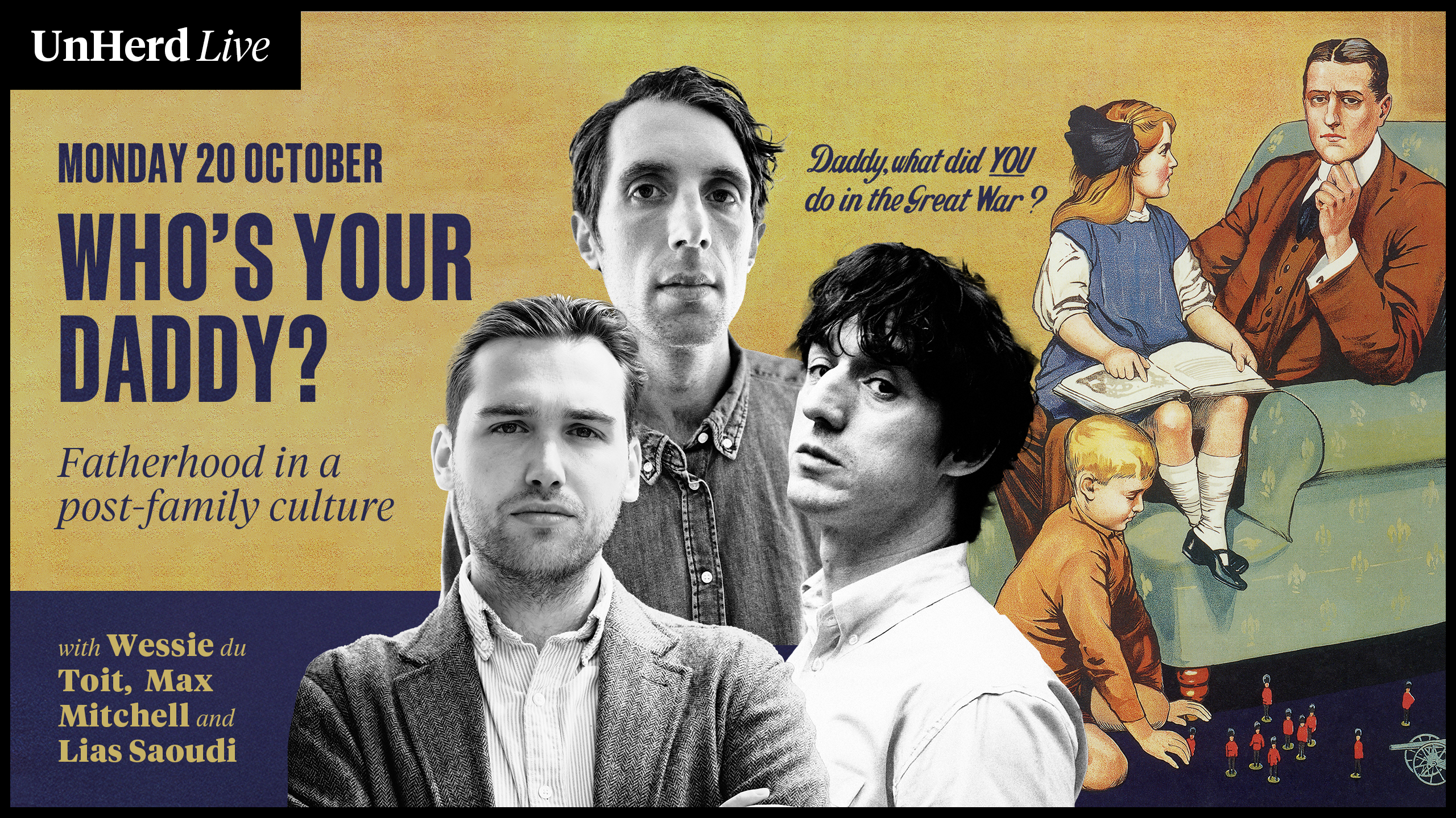 With rapidly declining birthrates across the Western world and the systematic dismantling of patriarchal family traditions, what will become of fatherhood? Writer Wessie du Toit, UnHerd’s Max Mitchell and Fat White Family frontman Lias Saoudi have all recently become first-time dads. Join them for an evening of frank conversation and big questions about what it means to parent in these anti-paternal times.
